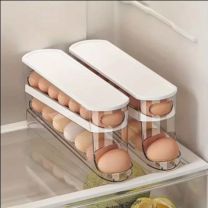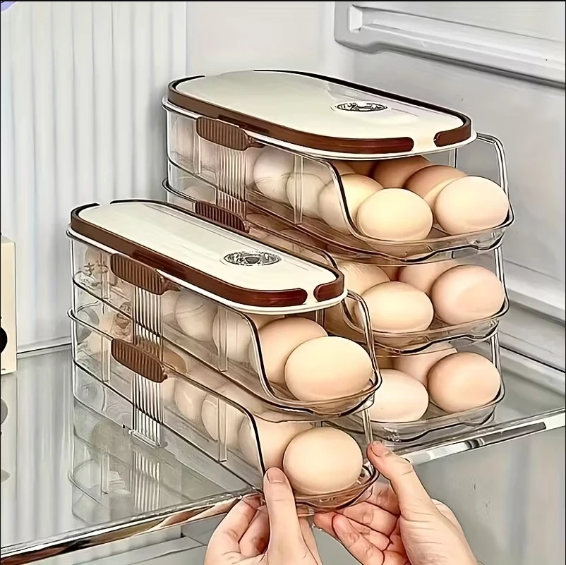 A Three-Tier Egg Holder for The Refrigerator Can Hold Up to 20 Eggs at Once, Featuring an Automatic Rolling Design for Egg Storage And Distribution.